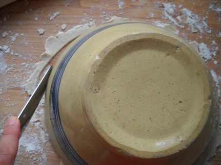 - Sprinkle a little more flour mix on dough; flip and roll out into about a 9-inch circle with a floured rolling pin. I usually like the heavy old-fashioned rolling pins, but for this recipe I prefer the lighter French dowels.